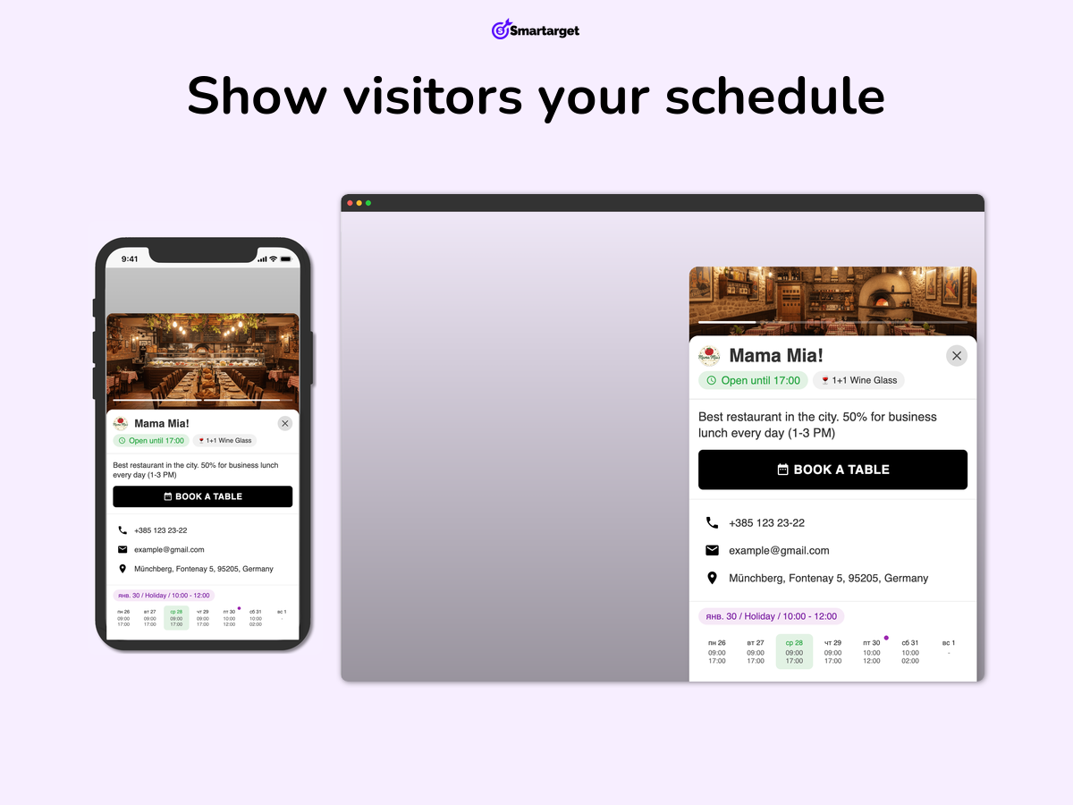 Business Opening Hours makes your availability super clear the moment someone lands on your Framer site. It shows a floating panel that displays your current status (Open or Closed) based on the hours you set, so visitors do not need to hunt for info on a contact page. Inside the panel you can also include the essentials like your phone number, email, and address, so people can call, message, or find you right away. You control the schedule with weekly hours for each day (for example different hours on weekends), and you can add special dates for holidays, events, vacations, or seasonal changes. Once this is set, the status switches automatically in real time, so your site always shows the correct availability without you updating anything manually.
