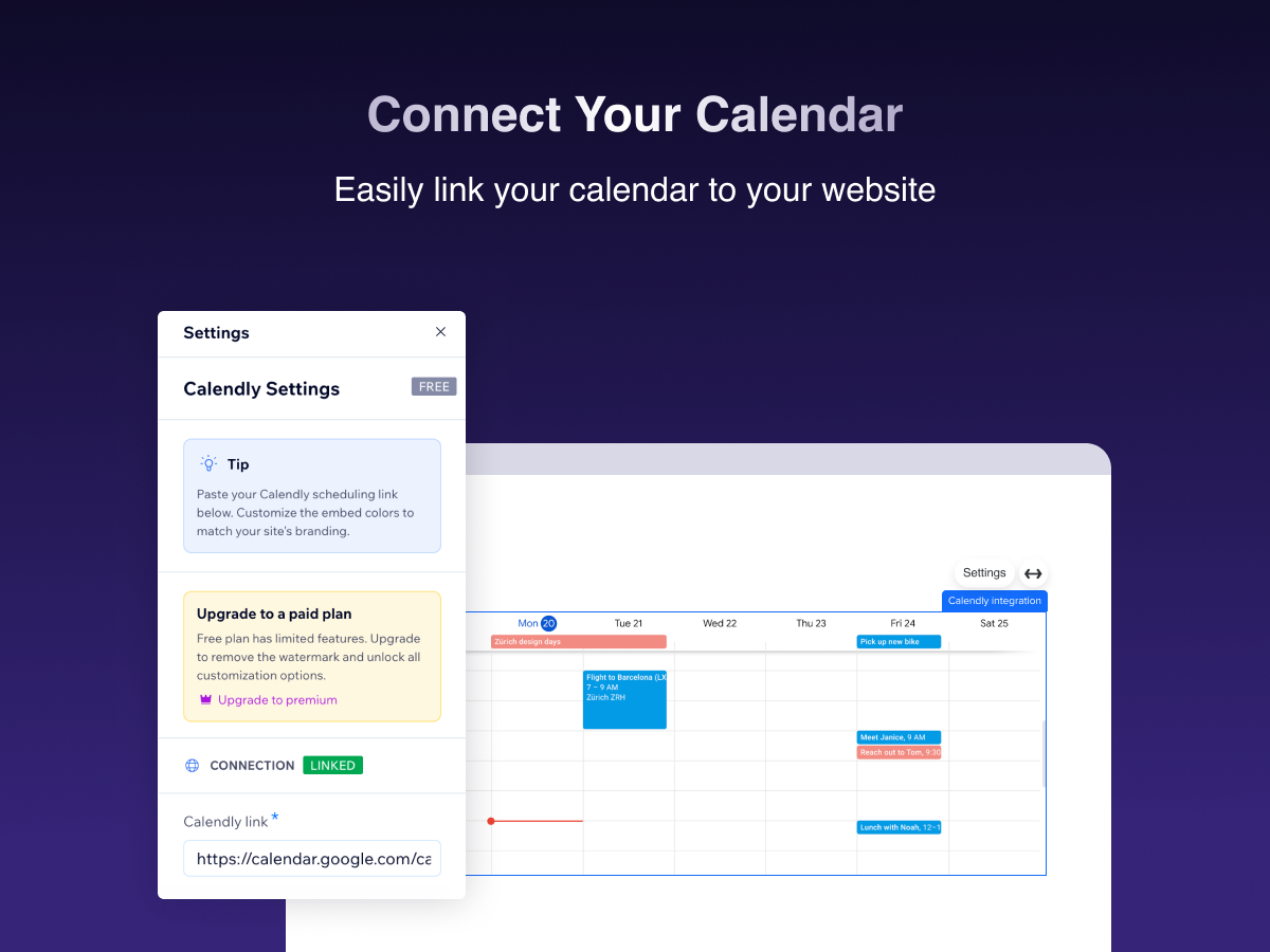 Calendly Integration lets you embed your Calendly scheduling page directly on your site so visitors can book meetings, consultations, or appointments without ever leaving your page, creating a frictionless scheduling experience for your visitors.