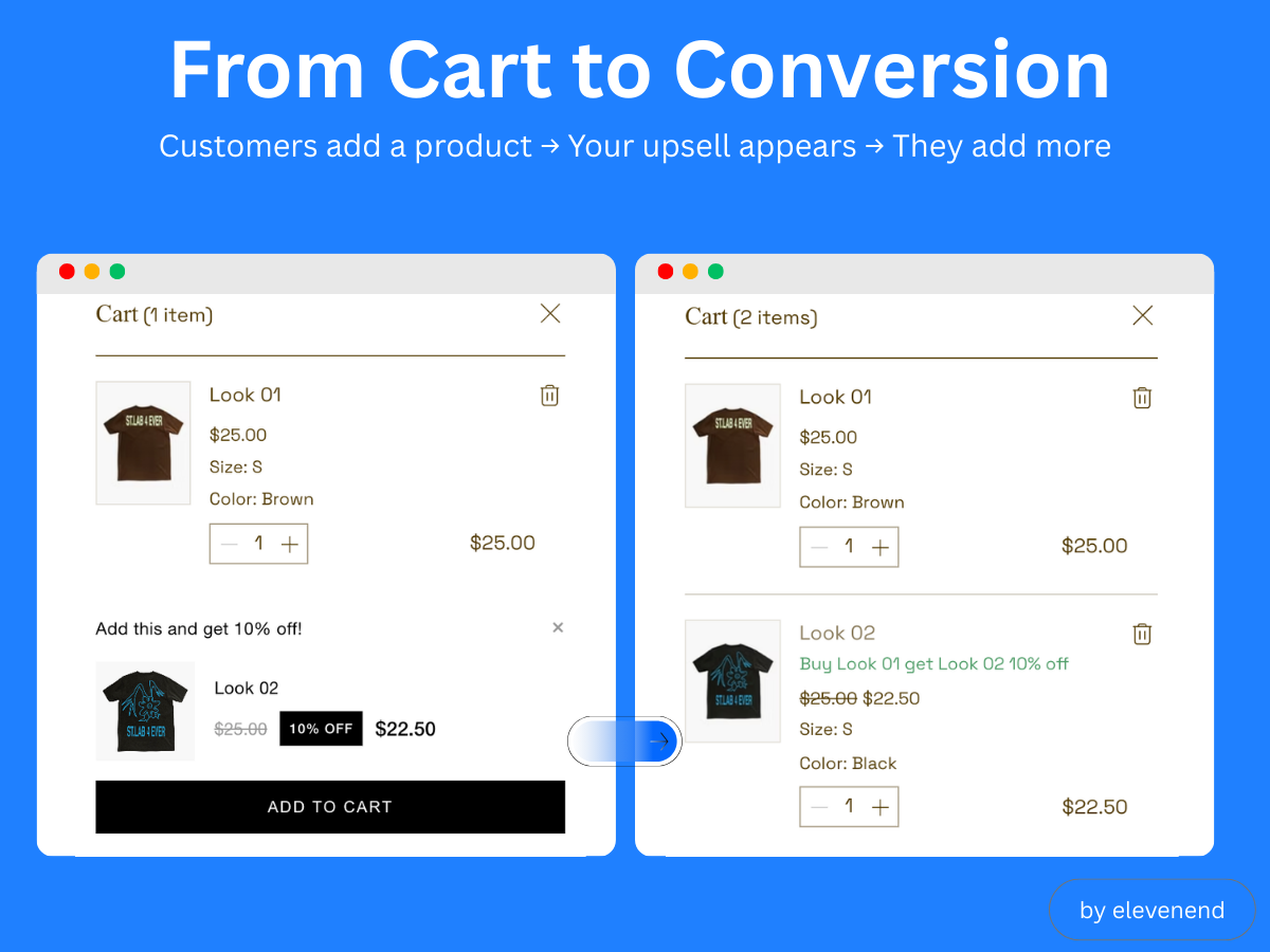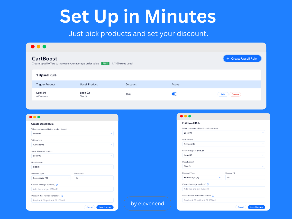 Create upsell rules that link trigger products to upsell products. When a customer adds the trigger product to their cart, they instantly see your upsell offer with an optional discount. One click adds it to their cart with the discount automatically applied at checkout.