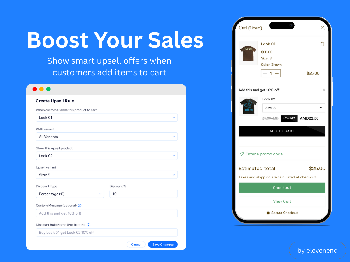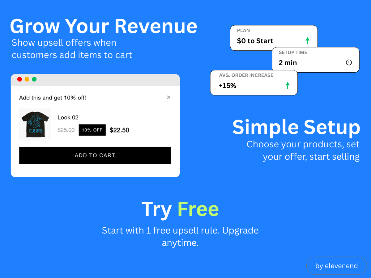 Start with our free plan to test it out, then upgrade for more upsell rules and advanced features like custom messaging and branded discount names.