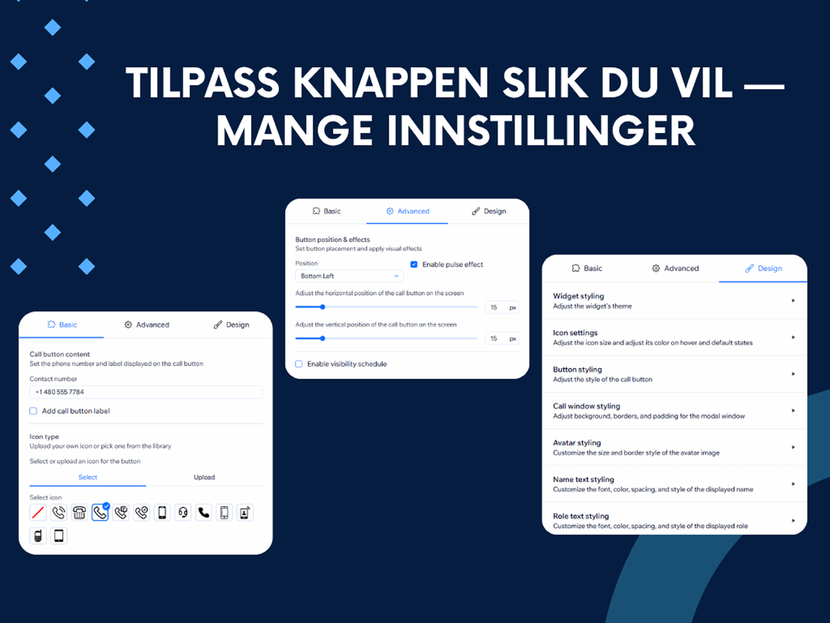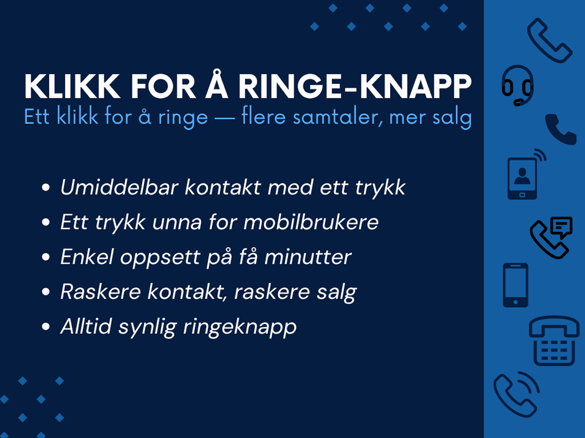 Klikk for å ringe-knappen gjør det enkelt for kunder å kontakte deg via en fullt tilpassbar flytende knapp. Øk engasjementet ved å legge til personlige meldinger og kontaktinformasjon for en mer imøtekommende opplevelse.