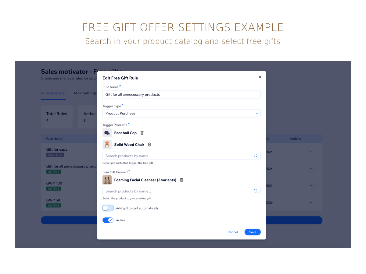 • Unlimited gifts offers for selected products (BOGO), or based on customers cart total value (GWP)