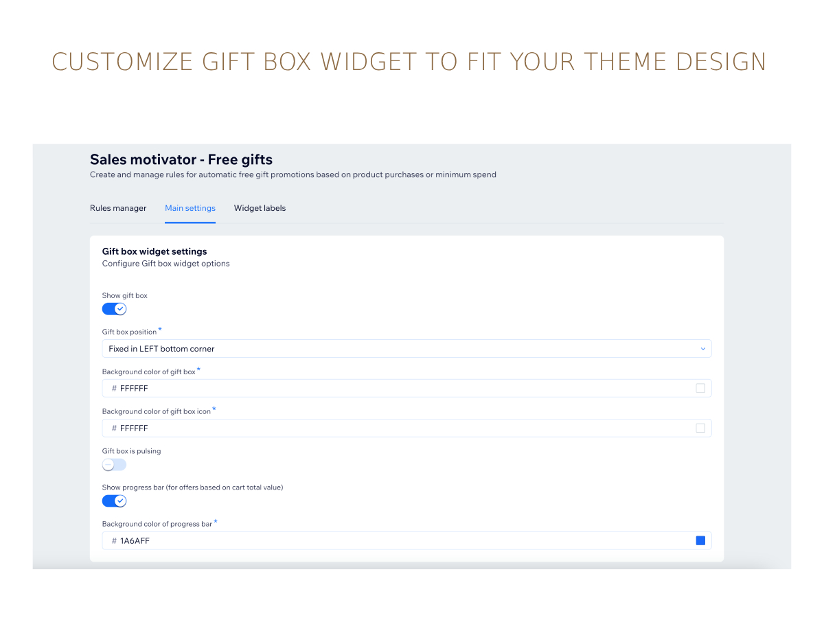 • Show and customize the design of the gift box widget to be a perfect fit for your storefront and theme